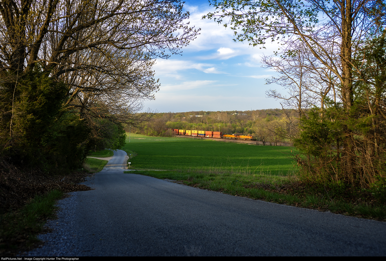 | As the sun approaches the horizon on the warm evening of Sunday, April 13, 2025, a westbound BNSF intermodal train cruises through a rural area near Verona, MO.