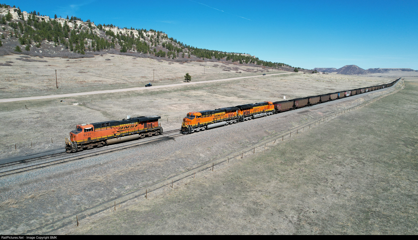 BNSF 3329 leads a loaded coal train past BNSF 6137 on the former Denver and Rio Grande line in some beautiful Colorado scenery just north of Colorado Springs.