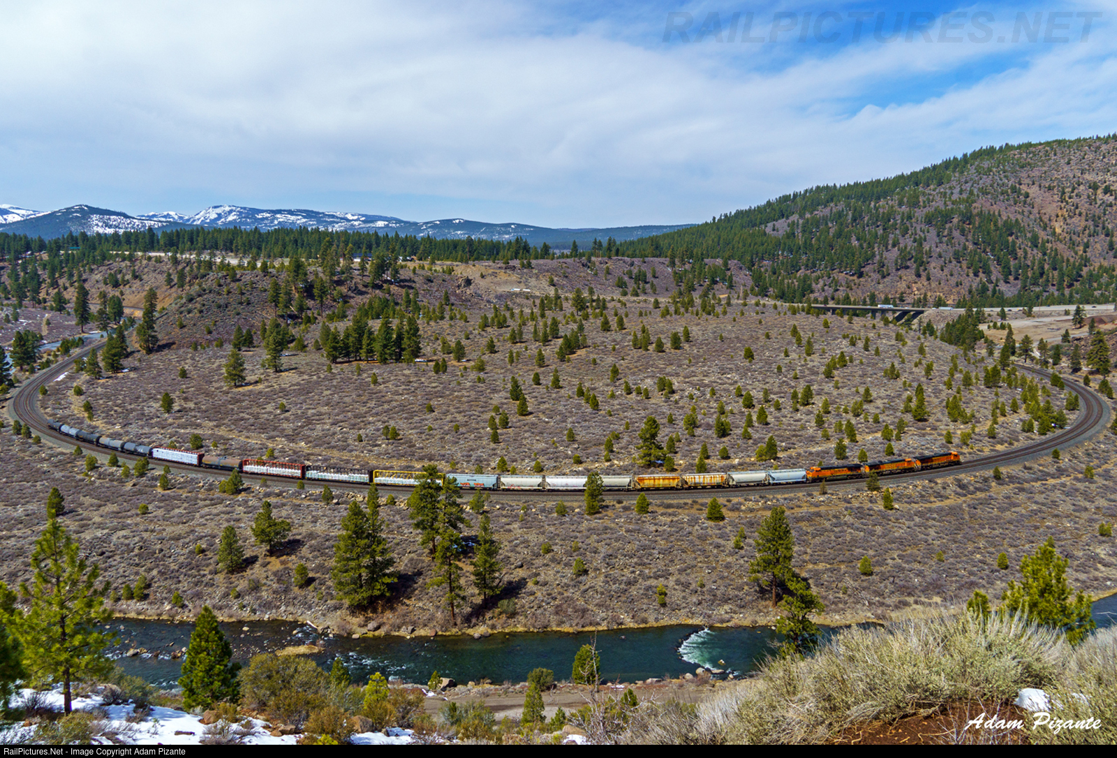 On a cool April morning on Donner Pass, a eastbounds BNSF very short mixed freight rounds a horseshoe curve at Glenshire just east of Truckee, CA. This train has trackage rights over Donner Pass, as it heads to Provo UT.