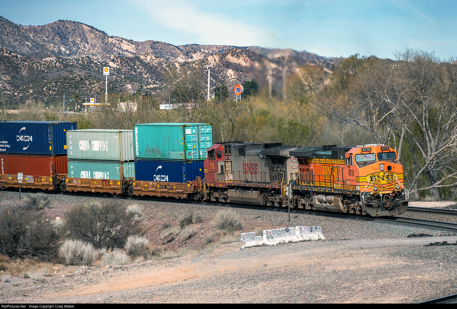 BNSF intermodal train S-LBELPK1-15L is already rounding Cajon Pass' Sullivan's Curve, but the rear Distributed Power Units, BNSF Dash 9-44CWs 715 and 4016, are just now rounding the curve leading to Sullivan's at the east end of Cajon. This train has 168 loaded cars (each well in an articulated car is counted as one "car" by the railroad), stretching for 14,551 feet (4.435 km), and has 35,200 horsepower (BNSF ES44DC 7550, Dash 9-44CW 5417, ES44C4 7163 and Dash 9-44CW 4317 up front, ES44C4 6635 and Dash 9-44CW 5118 as the mid-train DPUs, and Dash 9-44CWs 715 and 4016 as the rear DPUs) to get it up and over Cajon Pass' 2.2% grade, and many other mountain grades as well, as it heads from Long Beach CA to Logistics Park Kansas City KS. (Cajon Pass, California – February 16, 2025)