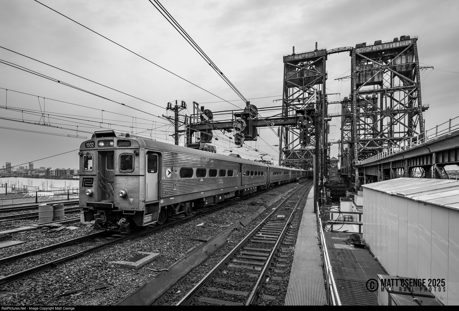 NJ Transit Arrow III car 1502 is the lead unit on Northeast Corridor Line train 3723, seen crossing Dock Bridge and approaching Newark Penn Station. |
