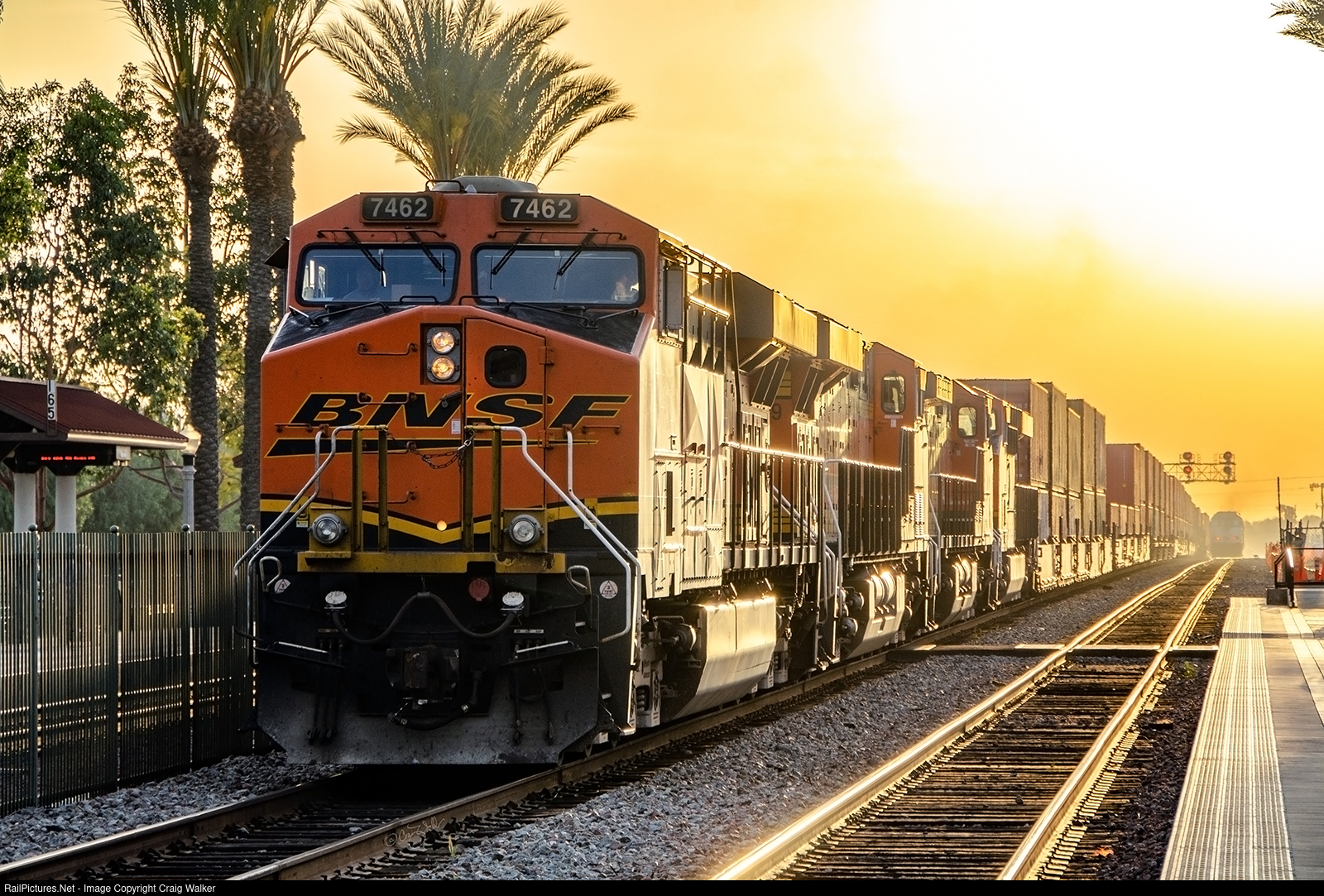 At sunset, as Metrolink train 606 departs the Fullerton station on Track 1, BNSF Intermodal Stacks S-LHGLPC1-30A, bound for Chicago, Illinois' Logistics Park from the Los Angeles Harbor, holds for a red signal on BNSF San Bernardino Sub's Track 2. It is holding for Metrolink train 608, arriving soon on Track 3 but, due to another Metrolink train striking a pedestrian in Anaheim, it will cross to Track 2 and head to Atwood, in Placentia, then reverse and travel down Metrolink's Olive Sub, by passing Anaheim, to continue its trip from Los Angeles to Oceanside. This freight has a long way to go, and it seems to have adequate power (with ES44DC 7462. ES44C4 6636, Dash 9-44CW 4491 and ES44C4 6901 supplying 17,600 horsepower), so this brief delay shouldn't affect it much. (Fullerton, California – March 30, 2012)