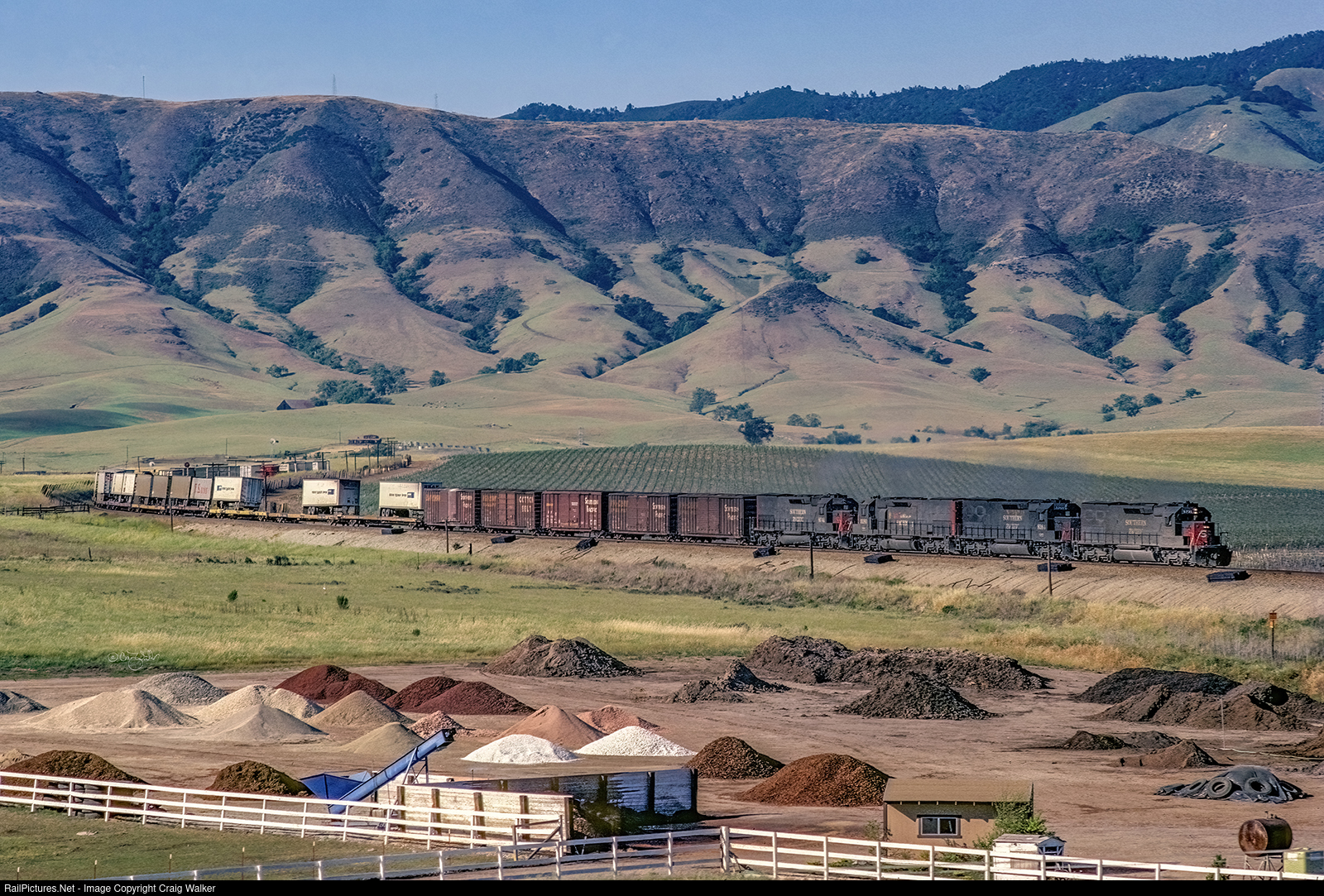 A quartet of Tunnel Motors lead an eastbound Southern Pacific freight as it departs San Luis Obispo with California's Coast Range mountains (and a vineyard) for a backdrop. The power is SP SD40T-2 8235, SD40T-2 8384, SD45T-2 9180 and SD40T-2 8541. SP’s Coast District is geographically a north-south line, but on the SP all operations were east-west, so this is actually a southbound train. (San Luis Obispo, California – 04/15/84)
