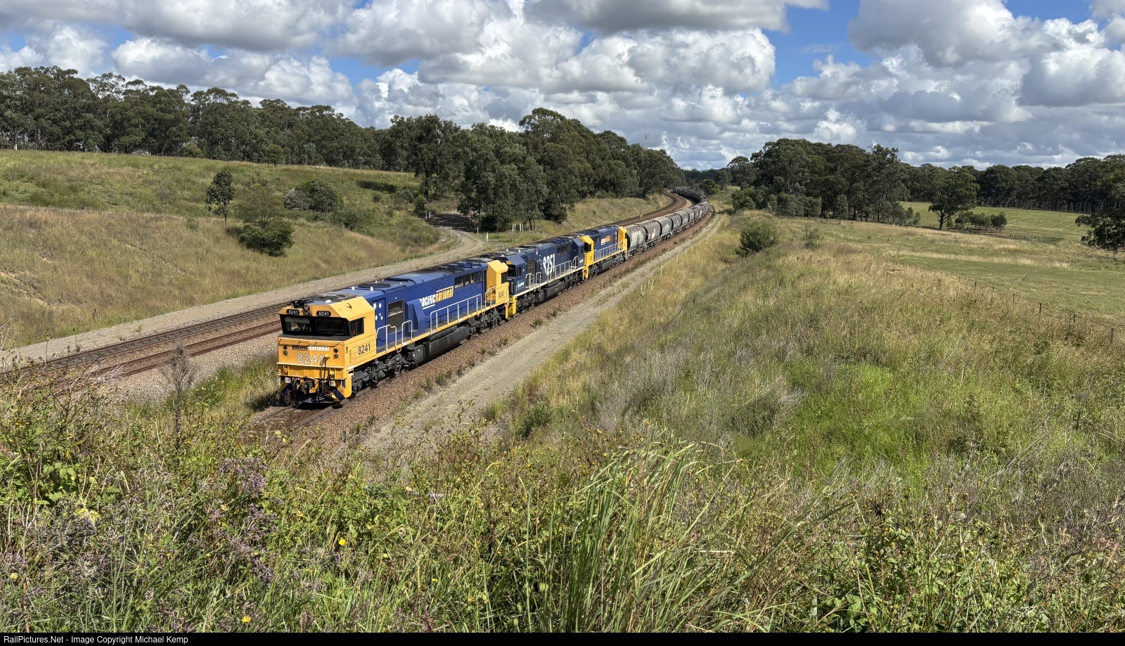 | 8241, 8251 and a third 82 with a load of grain for export pass Lochinvar heading for Port Waratah in Newcastle. |