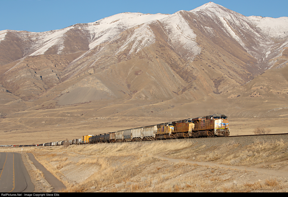 Westbounds between Lakepoint and Tooele, Utah along the Qquirrh Mountains range, struggle. It's a 800 ft. gain over about 8 miles 4200 ft. to 5000 ft. This train did better than most with three units up front, two in the middle, and one pushing on the rear.