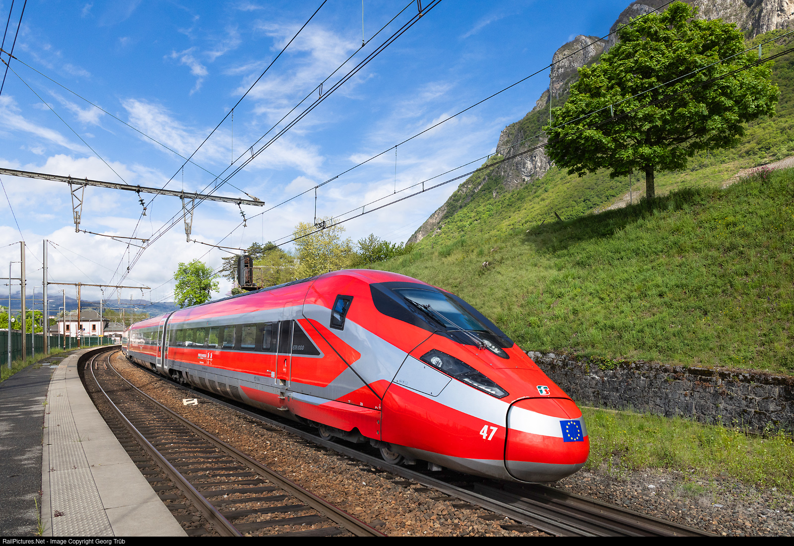 | "FRECCIAROSSA 1000" highspeed train ETR 400 # 047 of the Trenitalia is running the FR 9281 from Paris Gare de Lyon over the Mont Cenis line to Milano Centrale, passing through Montmélian near Chambéry. |