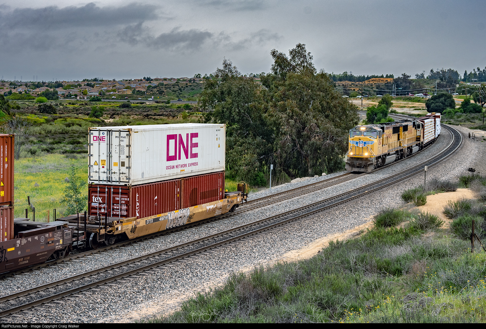 As Union Pacific intermodal train ILBG4-17 (Long Beach CA to Chicago IL) rolls through Beaumont, just about 200 feet (60 meters) or so behind it is UP local LOB86-17! Neither train was moving very fast, but the local (a pair of SD70Ms and three loaded cars) wasn't leaving a lot of room for error. The local is most likely going to stop soon, as there are industries about a mile ahead for which these cars are destined. (Beaumont, California – April 17, 2025)
