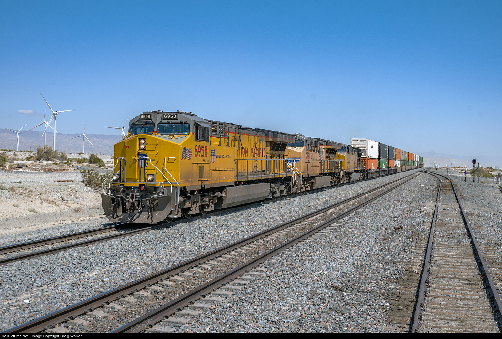 Winding uphill and threading its way through hundreds of wind turbines along this section of Union Pacific's Yuam Sub, UP AC4400CWM 6958 (ex-UP AC6044CW 7569, originally UP AC6000CW 7569) is teamed with ET44AC 2721 and Dash 9-44CW 6188 on the headend of hot UPS Expedited Intermodal train ZMNLA-14, heading from Marion AR to Los Angeles CA. In about 25 miles, this train will encounter rain. (Whitewater, California – April 17, 2025)