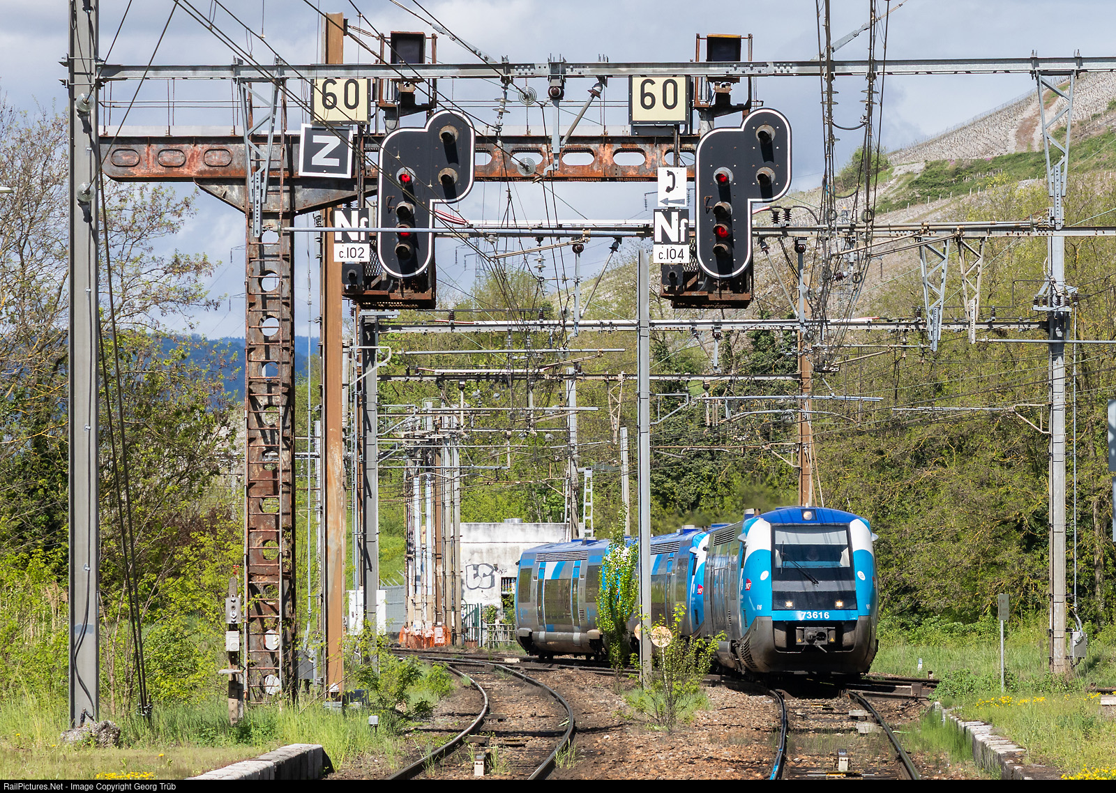 | Three coupled "Alstom Coradia A TER" of the X 73500 series of the SNCF, with X # 73616 in front, are entering Montmélian station, running as TER 883713 from Chambéry-Challes-les-Eaux to Grenoble. The X 73500 "Baleine bleue" series was built from 1999 to 2004 in a series of 312 by Alstom LHB. |