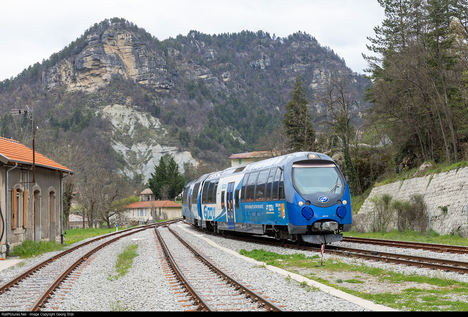| Double diesel railcar AMP # 803/804 of the Chemins de Fer de Provence (CP), entering Annot station, running train 4 from La Mure-Argens to Nice. The CP has 4 of this vehicles built by CFD in 2010. |
