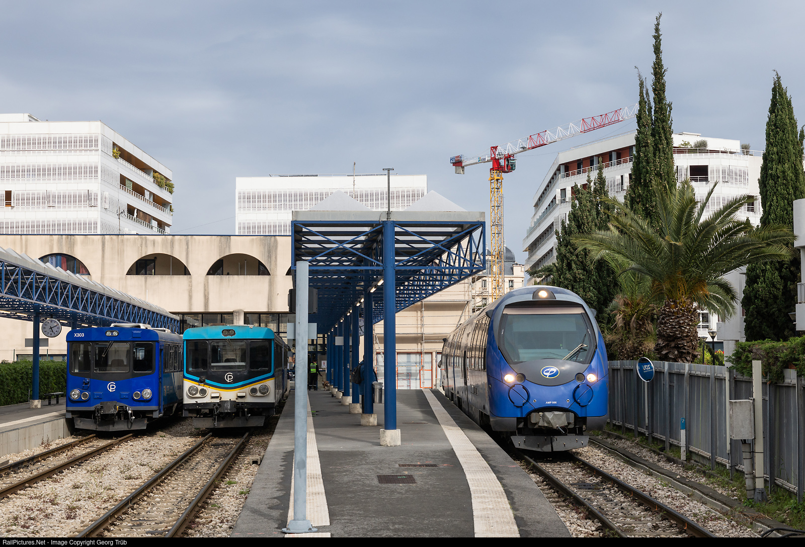 Gare Nice du Chemins de Fer de Provence (CP), with departing train 5 (right) to La Mure-Argens (-Bus to Digne), with double diesel railcar AMP # 805/806 built by CFD in 2010. On the left are diesel railcars X # 303, # 306 (not visible), X # 303 and X # 307, which are not used during the weekend.