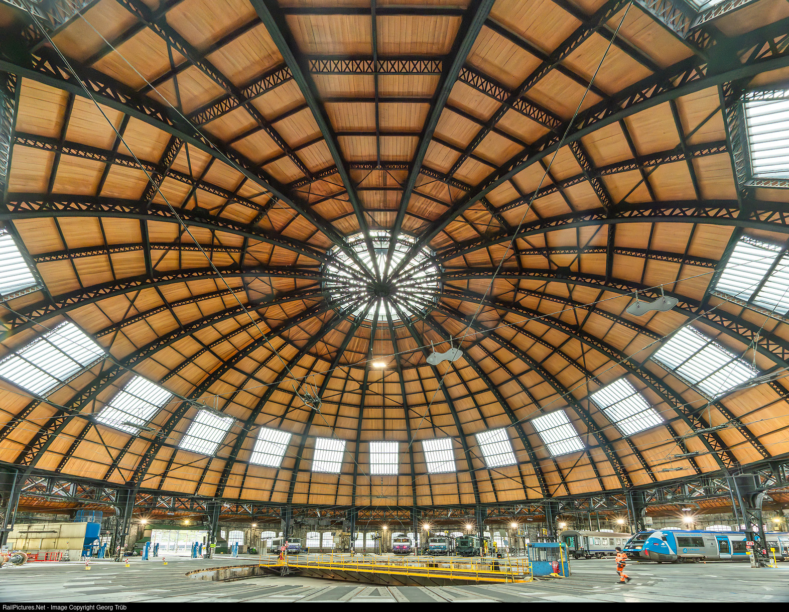 Built between 1906 and 1910, it is the main building of the Technicentre de Chambéry railroad engineering facility. This depot and maintenance facility is located 500 m north of the SNCF Chambéry - Challes-les-Eaux station and is connected to it via shunting tracks. The Rotonde de Chambéry is the largest locomotive depot of the “roundhouse” type built in France and is also the last and only French building of the “roundhouse” type with a completely covered interior. Together with the Castle of the Dukes of Savoy, this important work of industrial architecture is one of the most important sights in the departmental capital. The rotunda has been registered as a monument historique since 1984 and was awarded the Patrimoine du XXe siècle by the French Ministry of Culture in 2005. The building has a diameter of 110 meter and is 34 meter high, with 36 tracks for up to 72 locomotives/railcars. Only a small part of the building, which is used for round-the-clock maintenance and vehicle parking, is open to the public during tours.