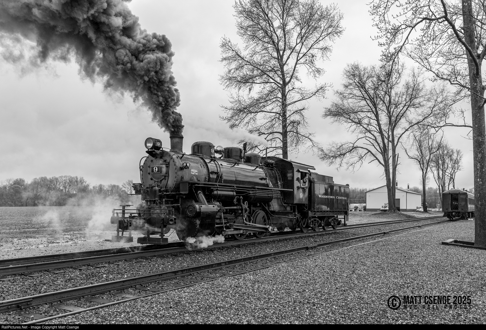 Woodstown Central Railroad 0-6-0 no. 9 is seen relaying around the consist at South Woodstown, with a particularly dark plume of smoke emanating from the stack. |