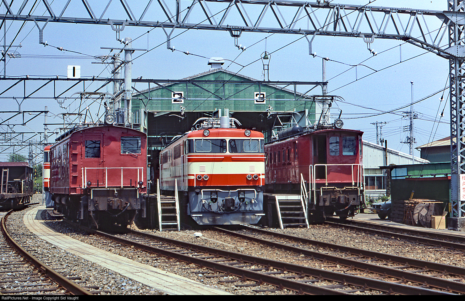 Seibu was of great railfan interest. It started in the mountains and ended (surprise) at the front door of the Seibu Department Store in Shinjuku. Freight and passenger. Equipment was immaculate and service was first class. Add to this electric locomotives from, if I remember correctly, three continents and five builders. Flanked by two legal aliens the impressive Japan-built unit is awaiting its next job.