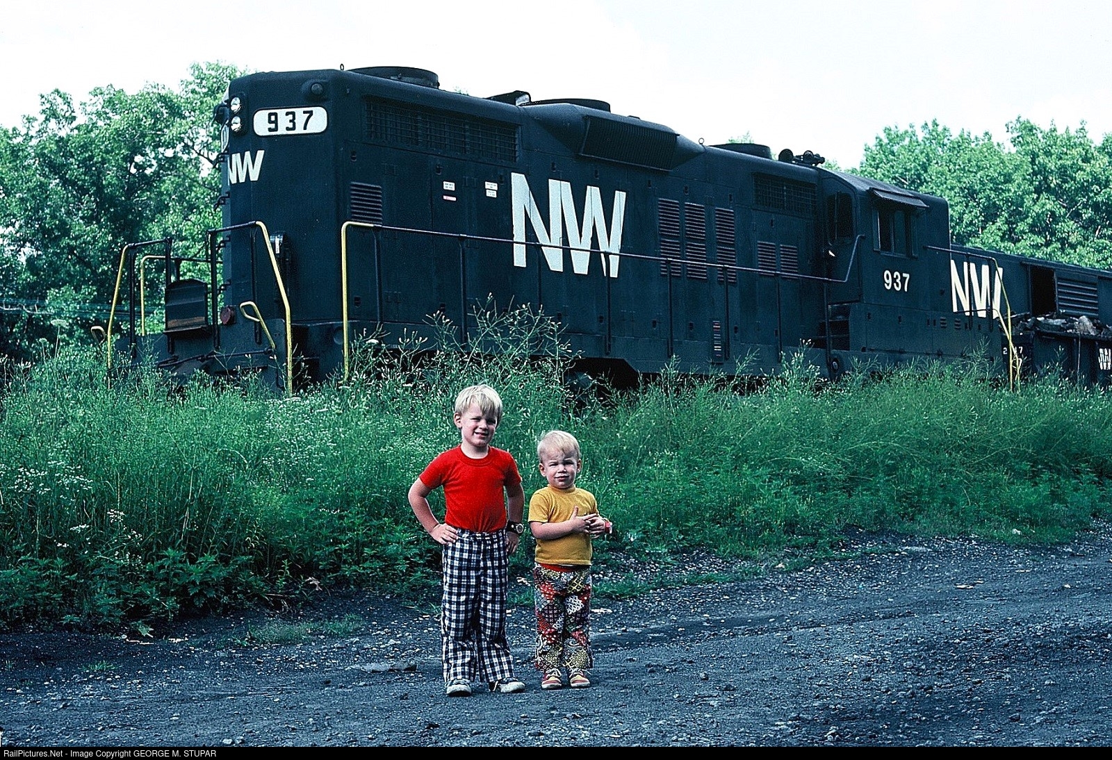 | Young Railfans. Good Times. Sons Mike and Jeff can still be found at trackside today, forty-seven years later, but it's uncertain as to whether or not the local road switcher is still in service. This former Nickel Plate Road yard was very busy during this era. Kodachrome 64 slide. |