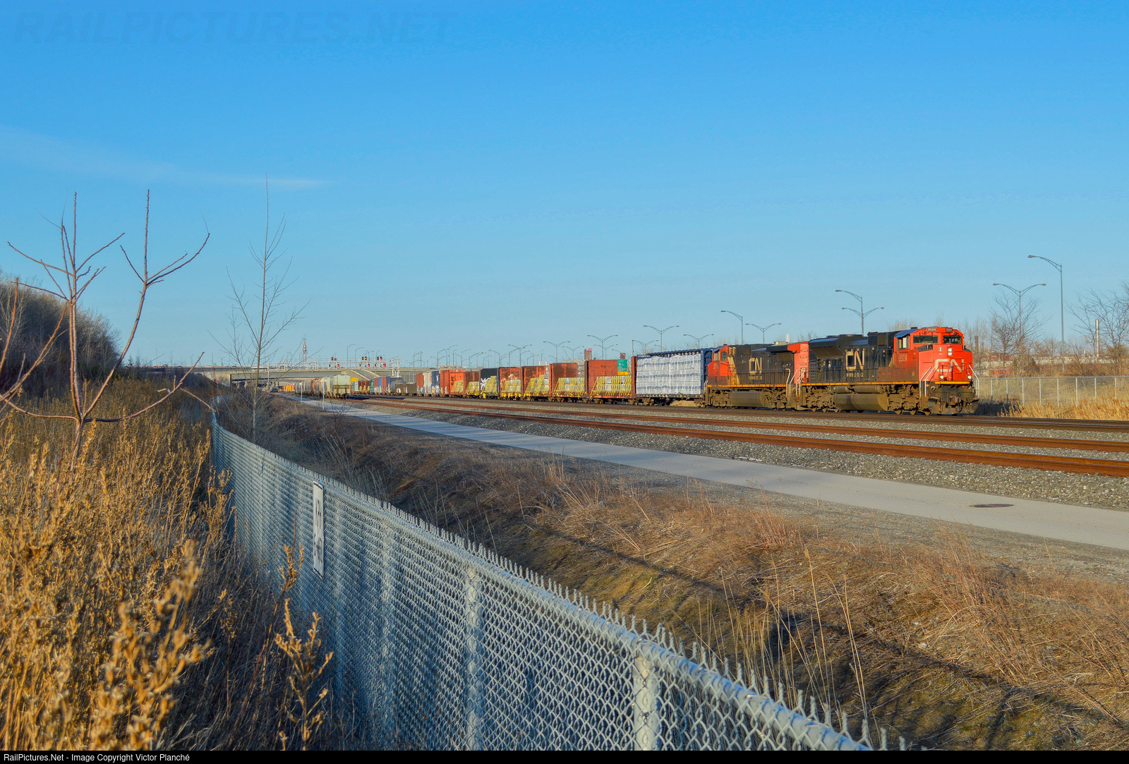 | On a glory afternoon, CN train 401 is approaching Taschereau yard, its destination, and rolls by the former Turcot yard area. |