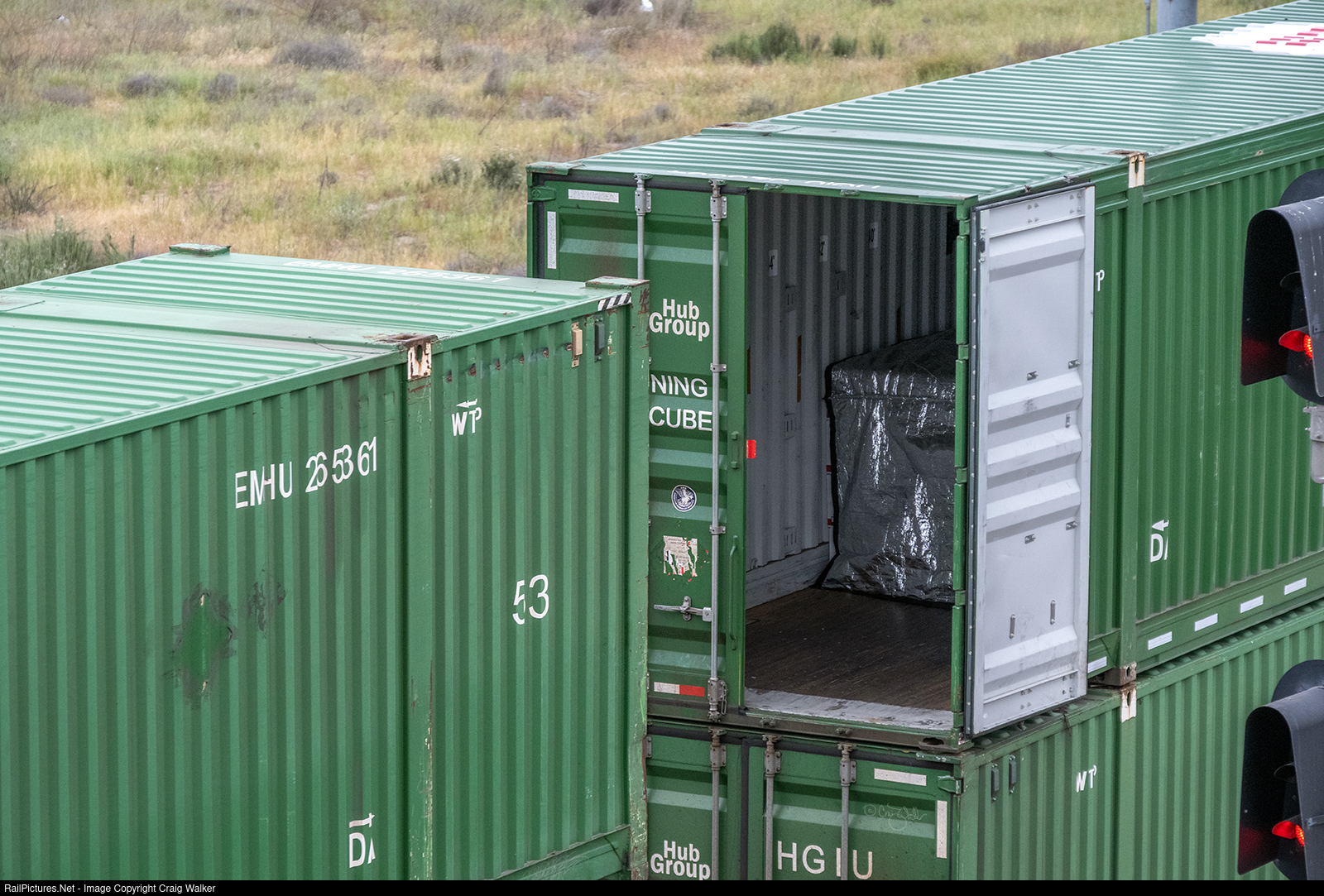 On Union Pacific westbound intermodal train ILTLB-16 were a high number of containers with their doors open (I photographed 5, but there were at least 12), and many looked as if some of their contents may be missing. Later in the day, we saw more open containers on an eastbound freight as well. And it isn't just UP getting hit as I've seen a few on the BNSF as well, plus there was an extensive article in the Los Angeles Times a few weeks ago about their trains getting burgled a lot lately. (Colton, California – April 17, 2025)