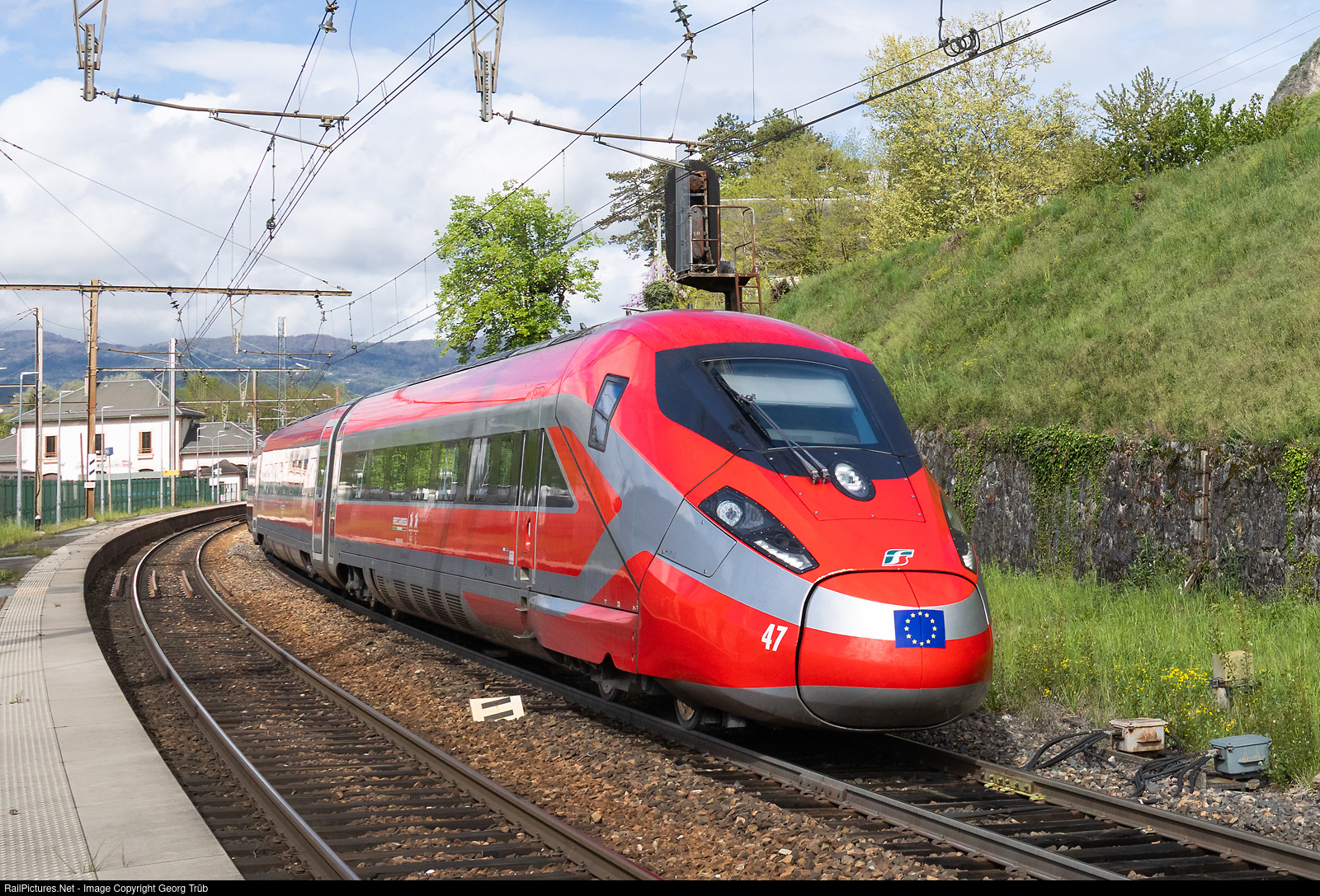 | "FRECCIAROSSA 1000" highspeed train ETR 400 # 047 of the Trenitalia is running the FR 9281 from Paris Gare de Lyon over the Mont Cenis line to Milano Centrale, passing through Montmélian near Chambéry. |