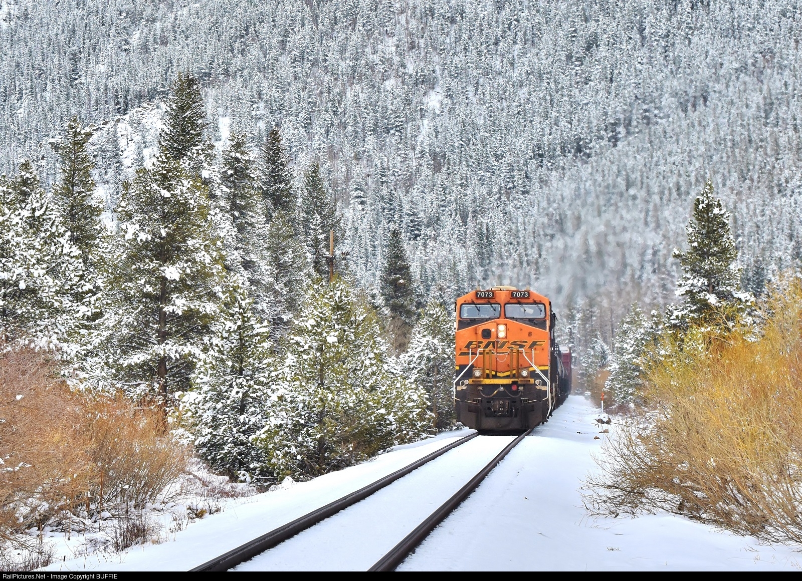 | Light snow falls in Tolland, Colorado as BNSF 7073 (ES44AC) shoves the Provo-to-Denver train into the Winter Wonderland of flocked pine trees on the Moffat Tunnel Sub.