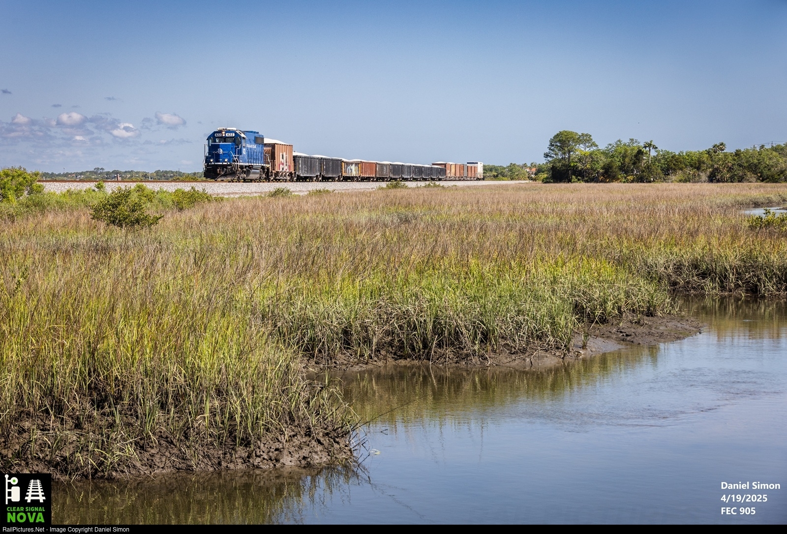 After a holding for through freights 204 and 202, Florida East Coast (FEC) Railway local train 905 comes out of siding at Magnolia. The train was slowly rolling through the wetlands alongside the San Sebastian River as it passed us. 905 operates between Jacksonville and Bunnell,