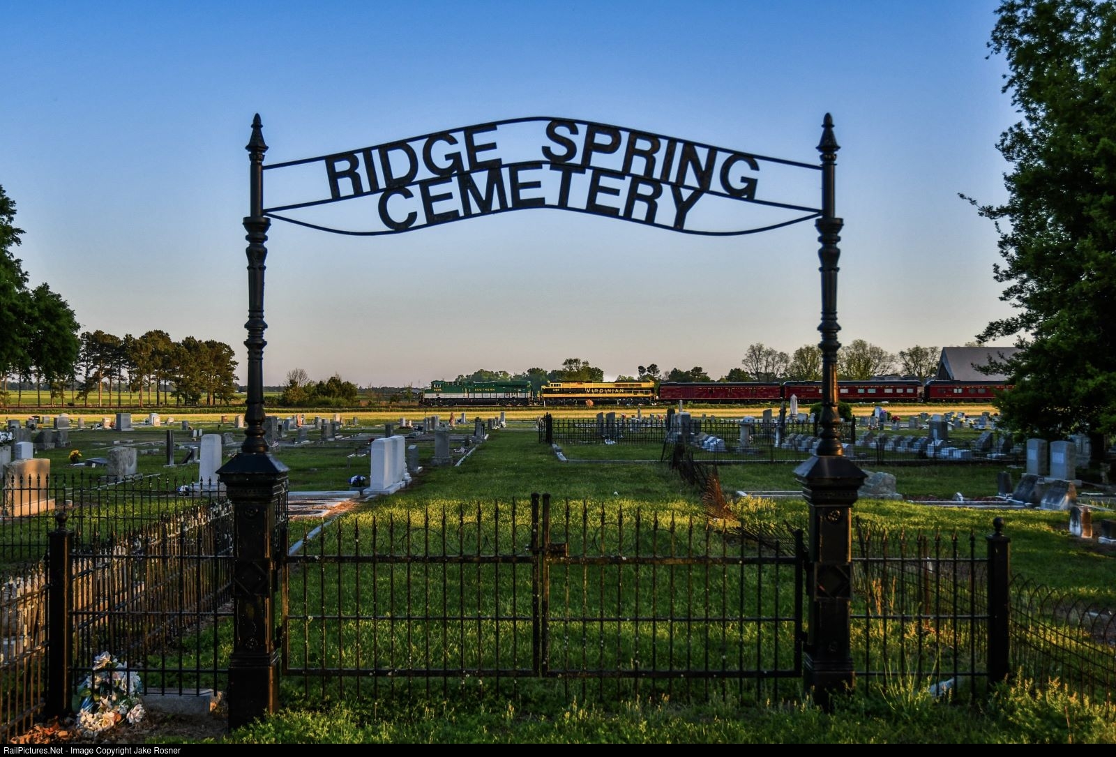 2 hours after leaving Augusta, NS 955 Slowly moves up the R line, running under a 25 MPH speed restriction the entire way to Columbia. After coming to a brief halt in downtown Ridge Spring, they pass the Ridge Spring Cemetary. This cemetery, dating to the early 19th century, was originally the Watson and Boatwright family cemetery before it was enlarged to become the town cemetery. Many descendants of Capt. Michael Watson (1726-1782) are buried in the walled section, built ca. 1850 by Chloe Wimberly Watson. They include Sarah Pressley Watson (1885-1959), who directed the Foyer International des Etudiantes in Paris 1920-1959.