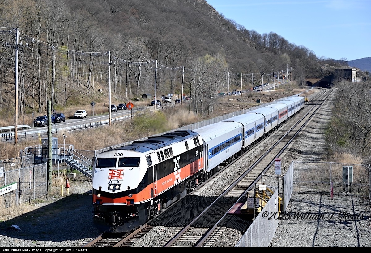 | CDOT New Haven inspired paint on P32AC-DM 229 heading for the walkup platforms at Breakneck Ridge. The station is used by hikers enjoying the trails in the area. The Metro North Railroad is upgrading the station and will be closed for the next two years during construction. |
