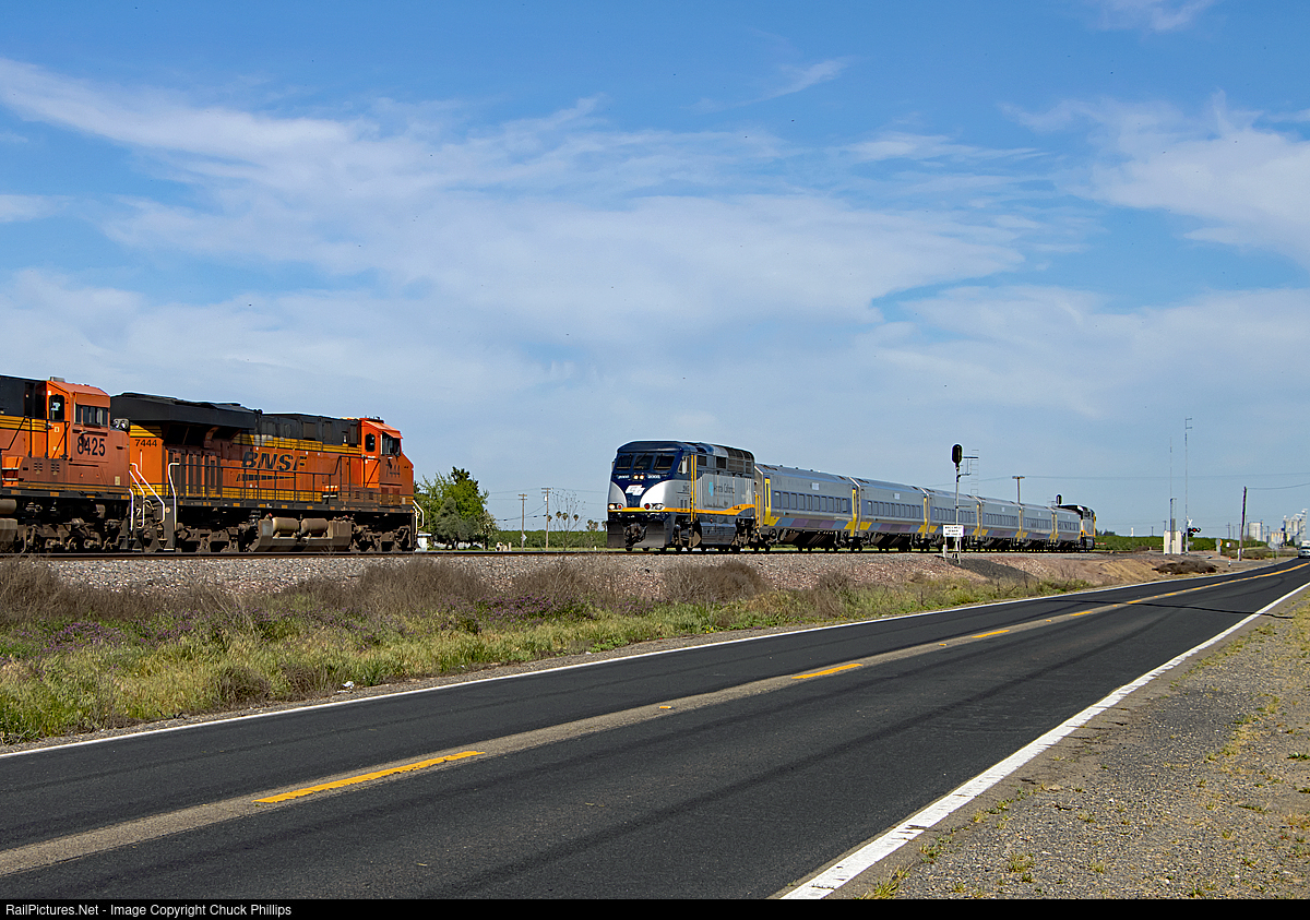 Southbound San Joaquin 710 meets a westbound BNSF local freight near Denair/Turlock Amtrak Station.