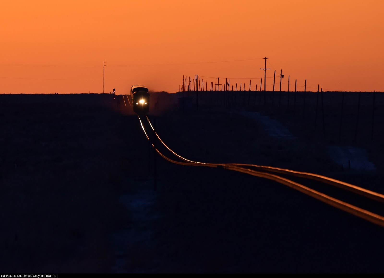 | Amtrak's California Zephyr runs over what appears to be a roller coaster track at sunrise as it heads towards Roggen, Colorado on the Brush Sub.