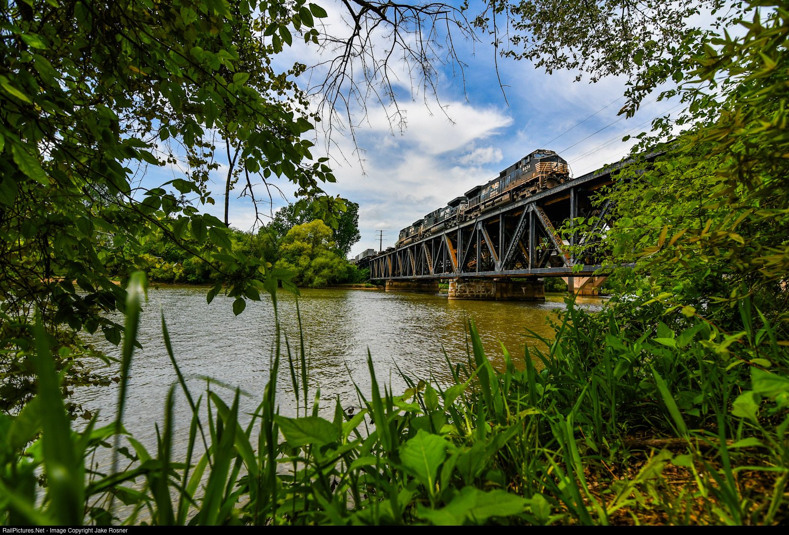 After coming to a stop in Salisbury to let 12R get into Linwood, the hottest train on the Piedmont division, NS 24X, hustles across the Yadkin River before crew changing at Farmers Crossing. Leading the way, a soon to be gone veteran Dash 9.