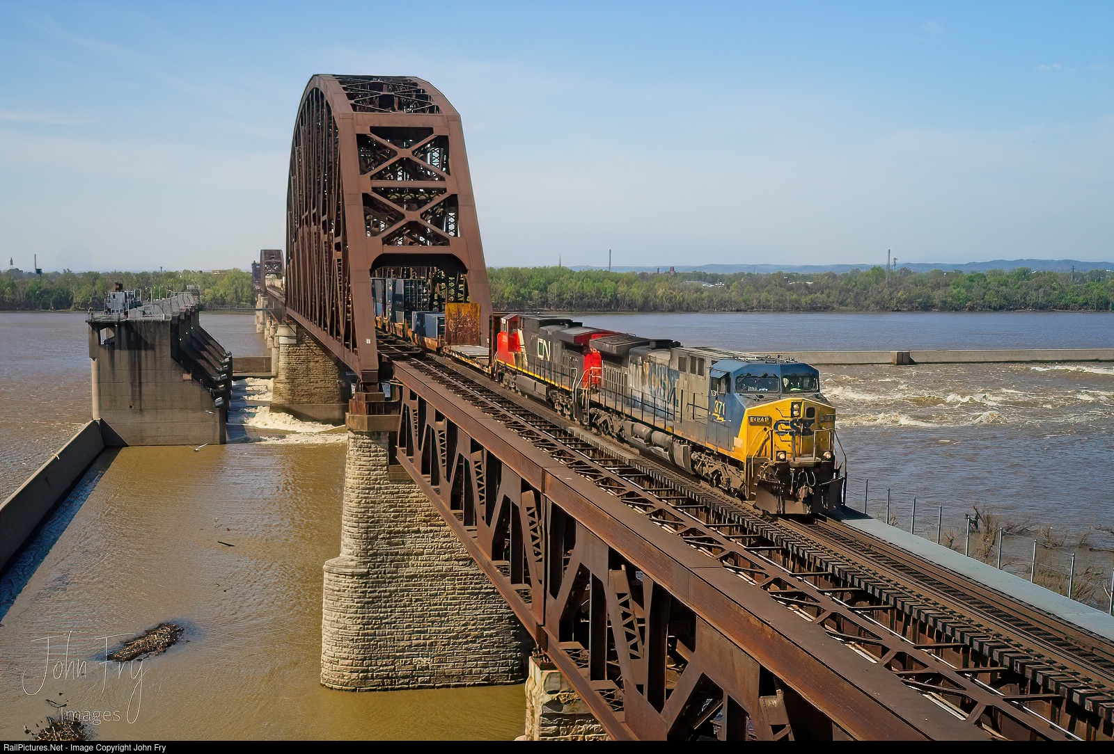 | A massive 10,000+ foot long M688 crawls its way across the mile long Ohio River bridge as it starts its journey north to Avon yard outside of Indianapolis. The YN2 leader has just crossed into Indiana while the bulk of the train is still in Louisville, KY. |
