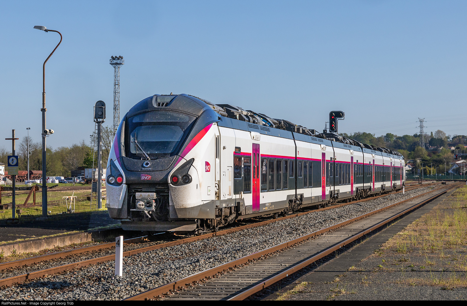 | Alstom Coradia Liner (Régiolis Intercités) B # 85041 of the SNCF is leaving Saintes, running the Intercity 3852 from Bordeaux via La Rochelle-La Roche-sur-Yon to Nantes. This six car B 85000 trains for 160 km/h have an electric drive from 1500 V DC or 25000 V 50 Hz AC as well as diesel traction. Newer trains are built by CAF France now instead of Alstom. |