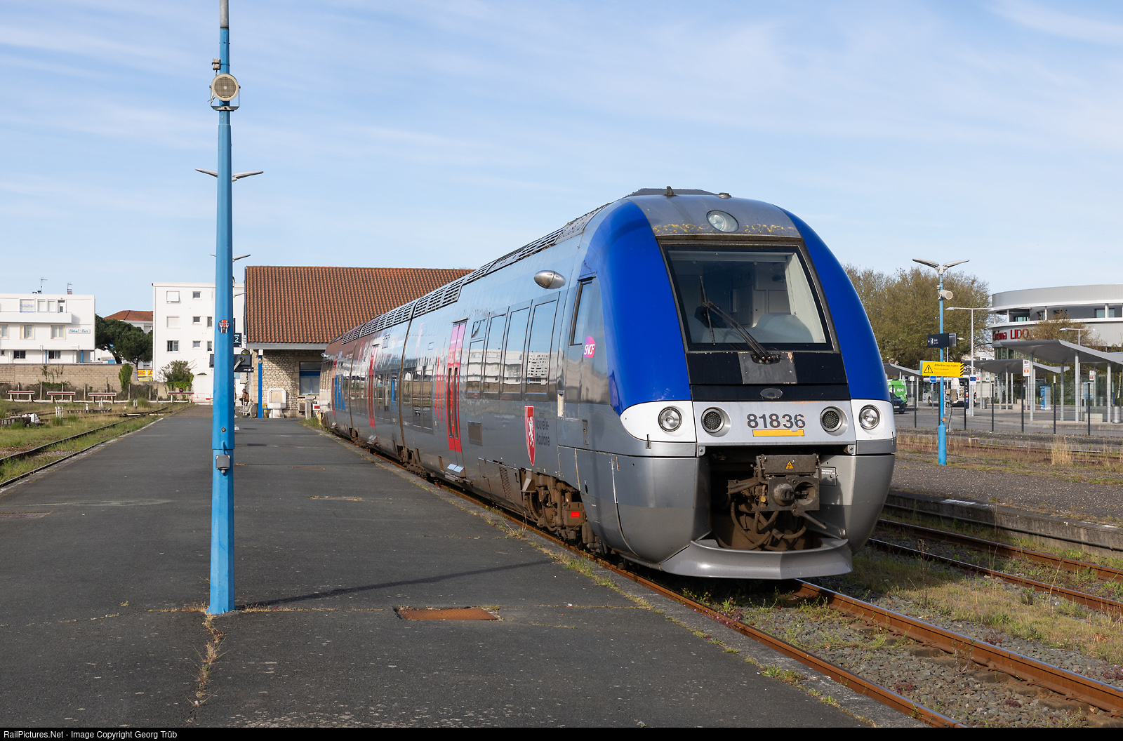 | "AGC" (automotrice grande capacité) B # 81836 of the SNCF in Royan. This is a vehicle for 1500 V DC and with diesel drive, called "BGC" too. 185 of this type for 160 km/h were built by Bombardier since 2004. |