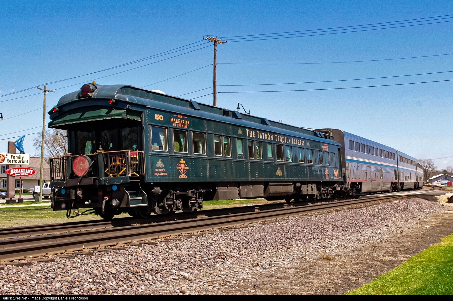 Have a drink aboard this private car, "The Patron Tequila Express", seen here bringing up the markers of Amtrak train #4, the Southwest Chief, which has just finished its station stop in Princeton, IL.