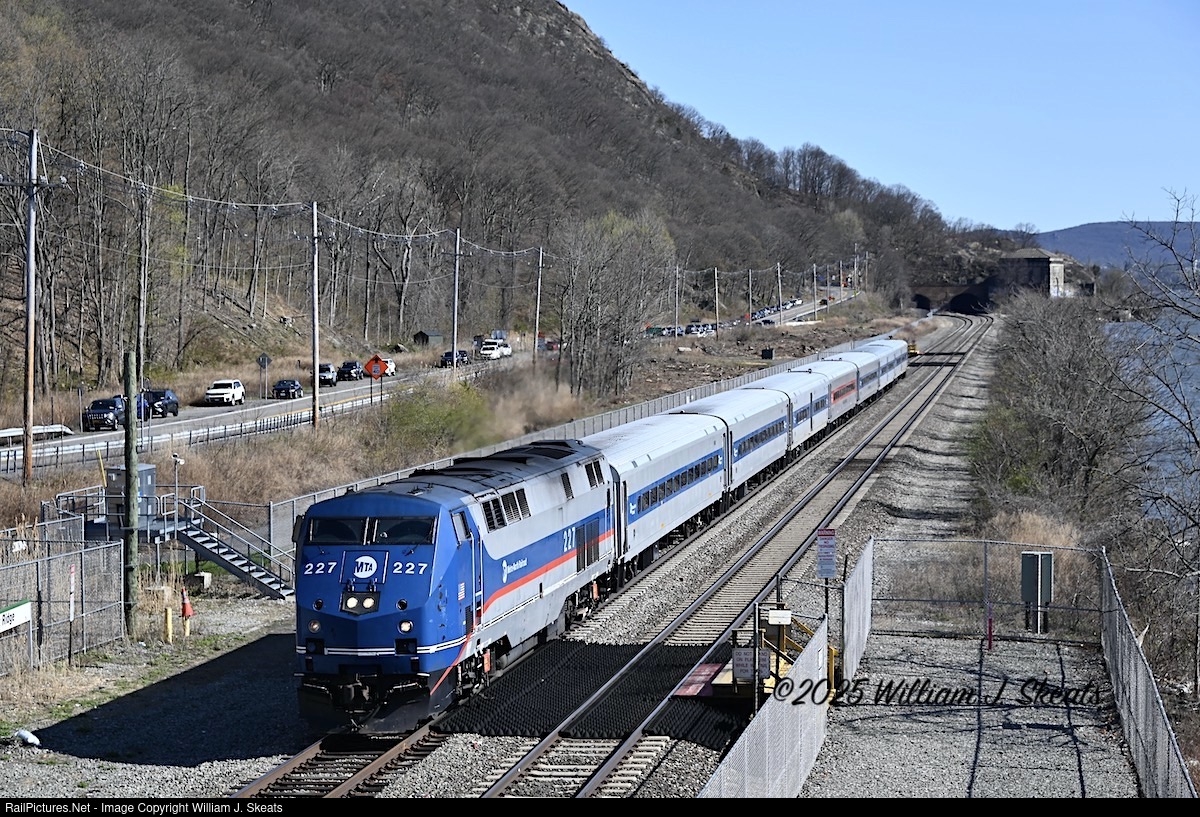 | P32AC-DM 227 heading past the walkup platforms at Breakneck Ridge. The station is used by hikers enjoying the trails in the area. The Metro North Railroad is upgrading the station and will be closed for the next two years during construction. |