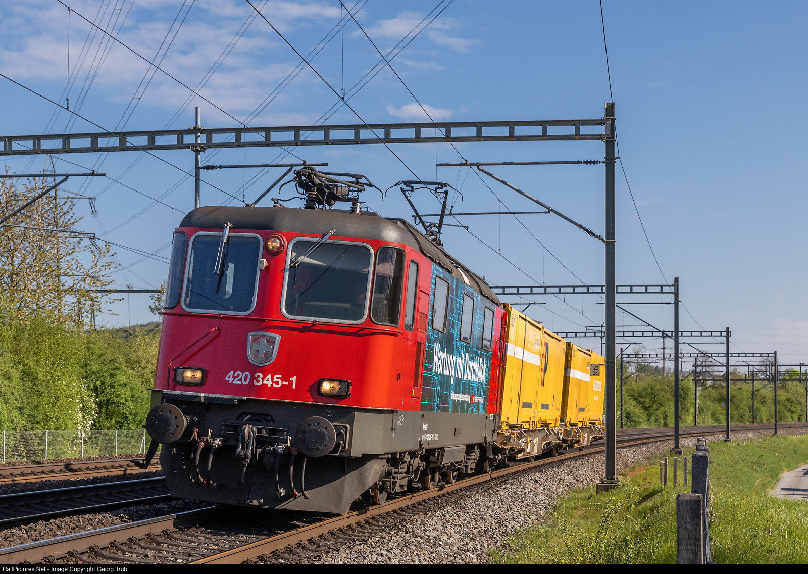 | Re 420 # 345 (Re 4/4 II # 11345) of the SBB in the "Wartung mit Durchblick" paint scheme pulls the short parcel mail train 50064 from Frauenfeld sort center via Winterthur-Kloten-Regensdorf-Brugg-Olten-Härkingen (sort center)-Biel-Neuchâtel-Daillens (sort center), between Winterthur and Winterthur Tössmühle. |
