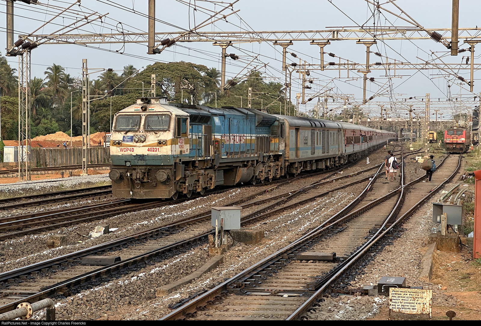 Train 17322, the Jasidih to Vasco da Gama Weekly Express, comes into Madgaon Junction station shortly before sunset on March 26, 2025. The train is 2, 531 KM into its 2,556 KM run, and Madgaon is its second to last stop before Vasco. Power is WDP4D 40231.