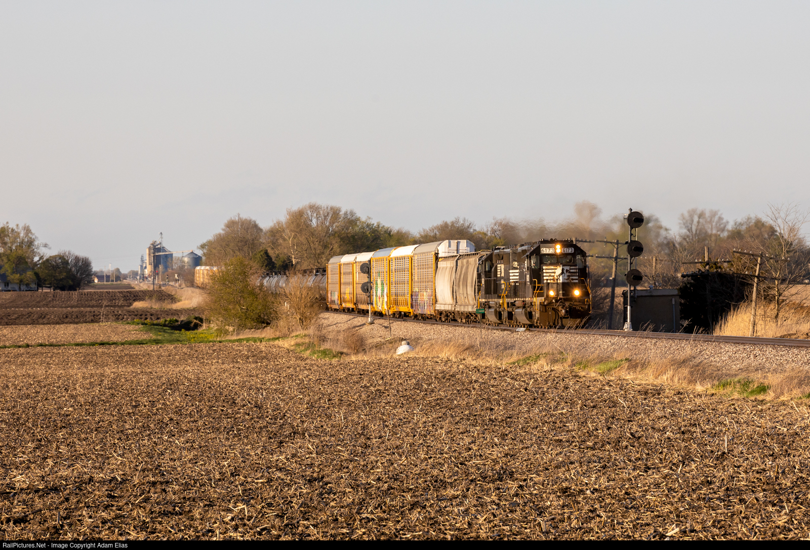 | NS 6173 making a dash South on the old Wabash mainline towards Decatur in the last hour of sun-rays. Coming into Gibson City the autoracks were up front, but a pickup in GC caused them to be moved two back. These auto racks are coming from Rivian in Bloomington at Good Yard. You couldn’t ask for better light, a better unit, or a more classic scene. |