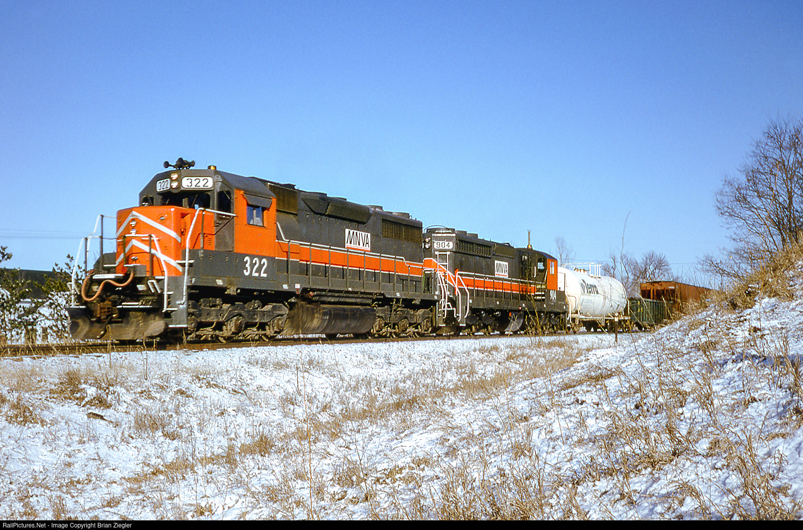 | Minnesota Valley with a westbound train near Tower E-14 in Minnetonka MN. MNVA had trackage rights to Norwood MN where their trackage began (which was ex-CNW/M&St.L). |