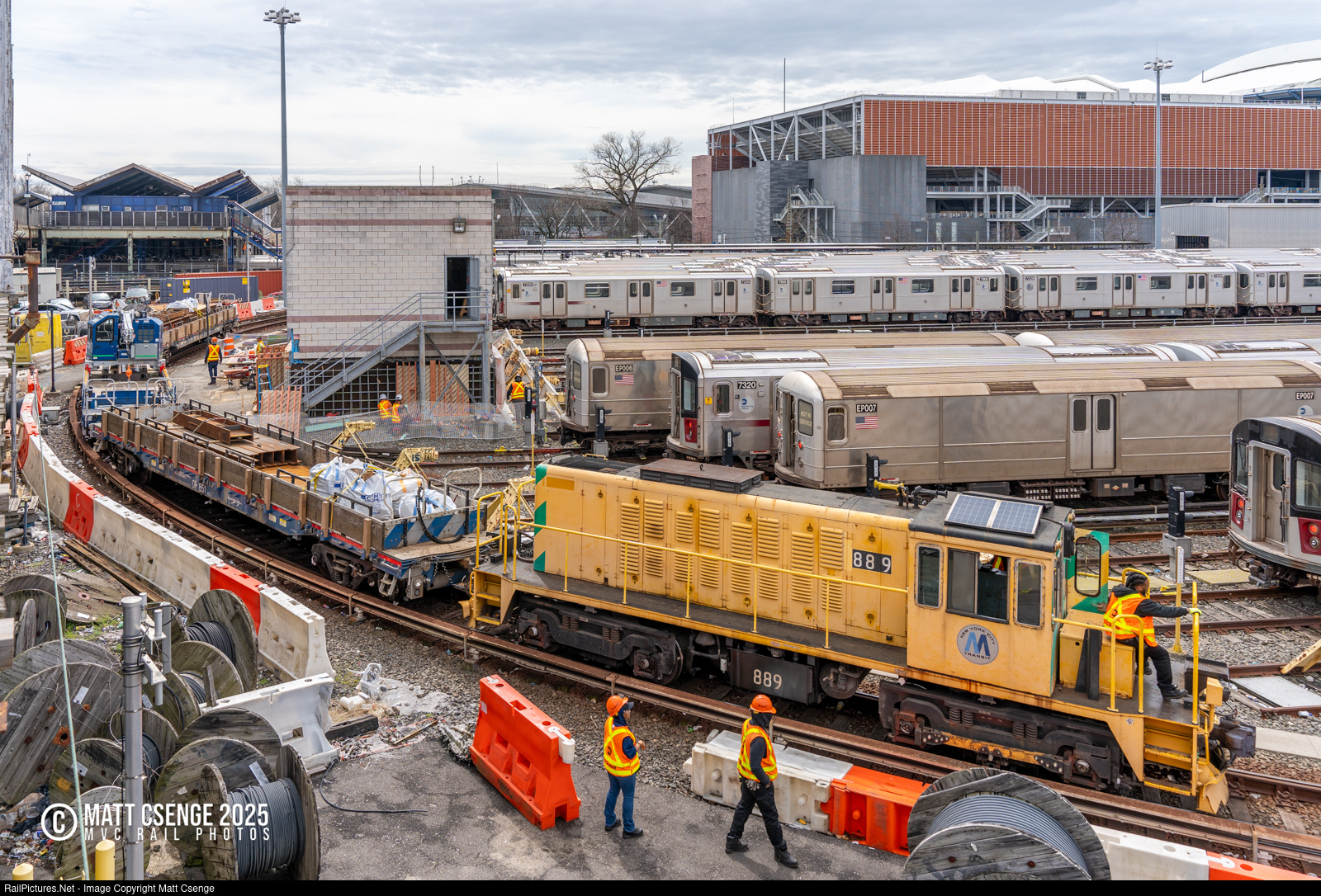 New York City Transit Authority (NYCTA) R77 locomotive 889 (GE SL50) is seen hauling a work train around the loop at Corona Yard. Also of interest are the multiple R127 refuse motors laid up in the yard, including EP006 and EP007. |