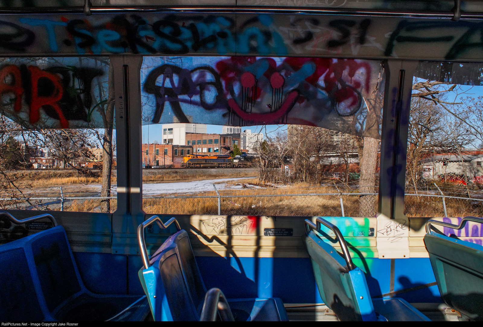 | NS 55W slowly moves through Downtown Greensboro, with the Jersey central heritage unit, NS 1071, leading the way. |