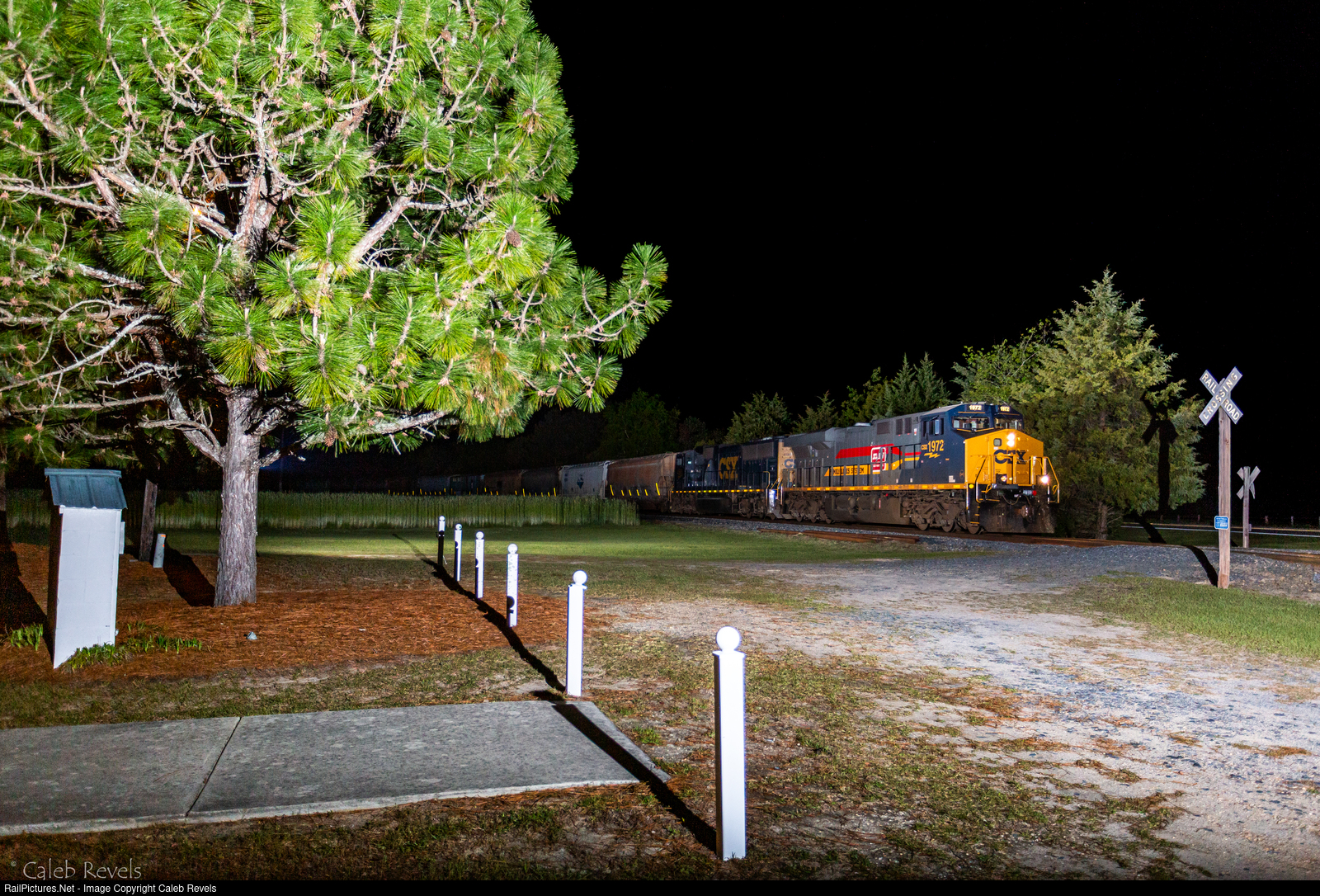 On a cold night in the Sandhills, the crew of the Candor side 201 brings 78 empty grain hoppers from Perdue in Candor back to the CSX Interchange in Aberdeen behind CSXT 1972, the Family Lines heritage engine.