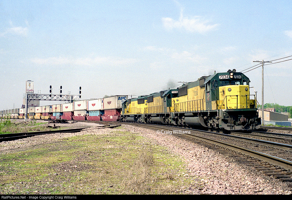 The "Zito Yellow" was first introduced on the CNW 5500s in 1981. Due to the poor paint in Pantone 102C yellow, a lot of units faded or changed colors. The first two orders of C40s came in, Zito, but due to the baking sun in the PRB, the units had to be repainted by 1991. 42 units were repainted by MAC in Kansas City. That ended the Zito era, and Stagecoach Yellow went on for the final few orders in the CNW days. All the SD50/SD60 came in Zito. Only a few got repainted before the merger. It was hard to get them in three-unit sets, at least for me. Here, a trio leaves Clinton with an APL stacker bound for Chicago.