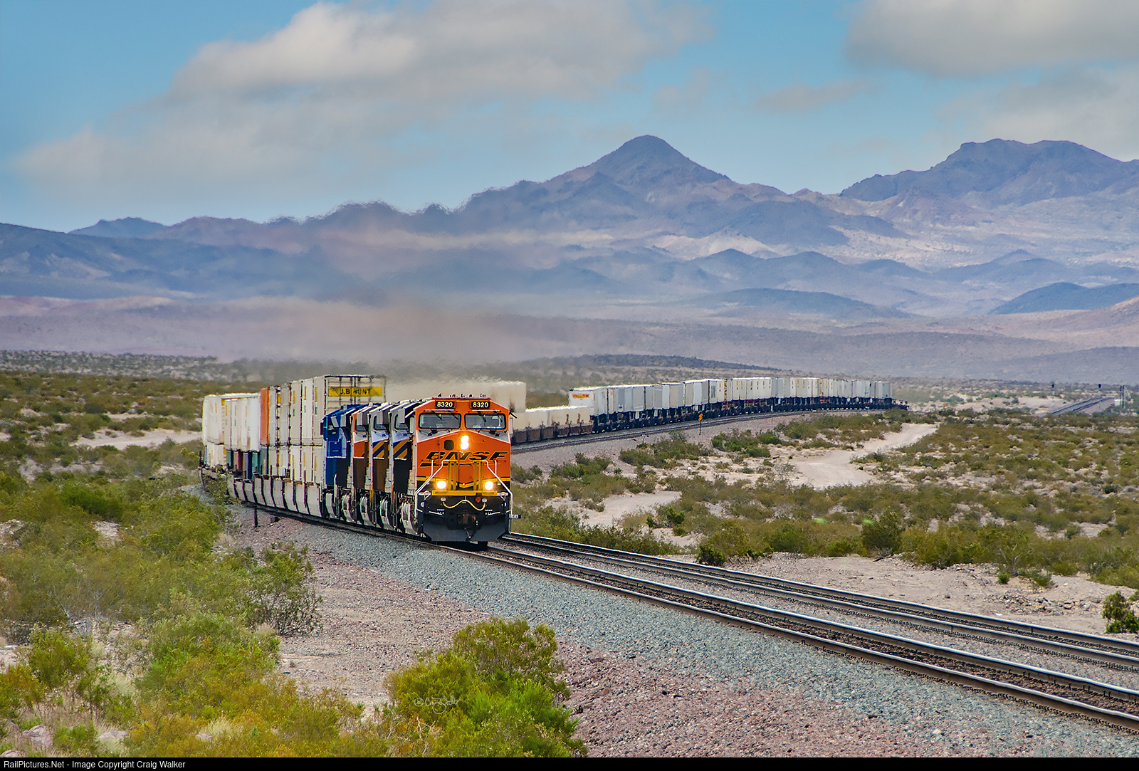 Approaching East Pisgah is BNSF train Z-WSPLAC9-24A (Priority UPS-LTL Intermodal; Willow Springs IL to Los Angeles CA) behind a colorful consist of BNSF ES44C4 8320, CREX ES44AC 1309, CREX ES44AC 1332, BNSF ES44C4 7103 and GECX ET44AC 2026. Pisgah is known for the ancient lava flows that the railroad traverses. (Pisgah, California – June 26, 2015)