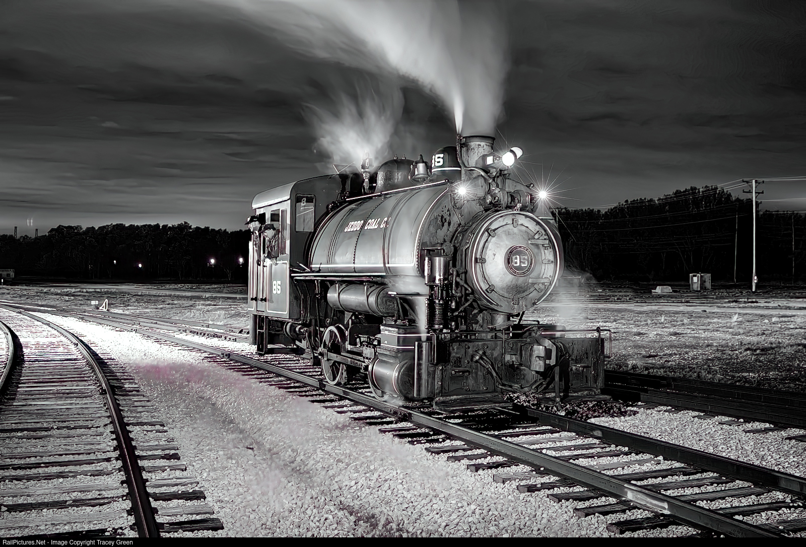 The Jeddo Coal 85 poses during the night shoot at the Railroading Heritage of Midwest America while the group's two historic diesels rest closer to the historic shops.