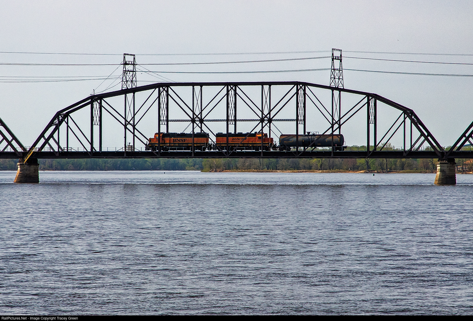 | Bridging the Father of Rivers. After waiting quite awhile for some water traffic to pass, this BNSF local finally starts moving across the bridge to the Illinois side to do some local work. |