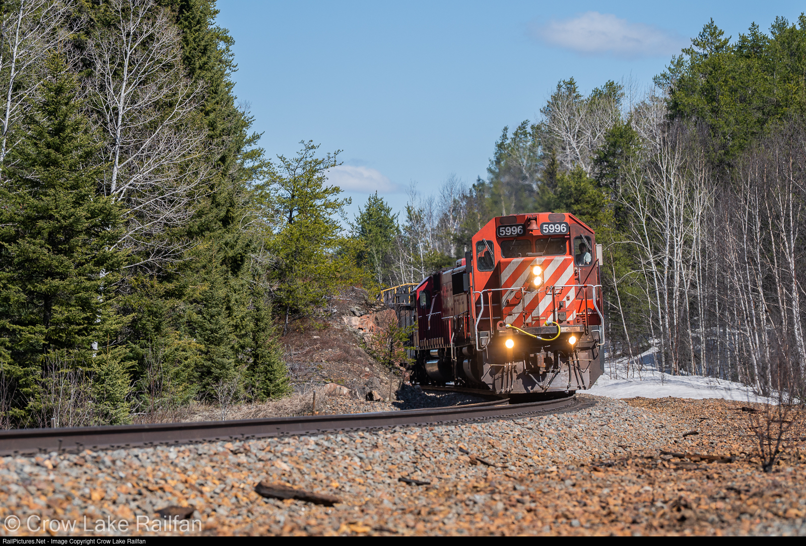 | A trio of venerable EMD's handle CPKC work train no. 2CWR-20 as they head west out of Chapleau on the White River sub.
