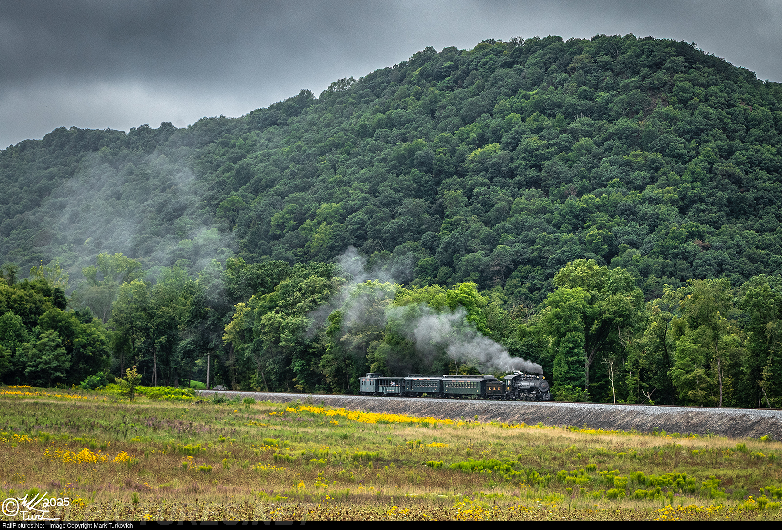 East Broad Top 16 rolls along the Long Fill with its passenger train on a cool summer morning.