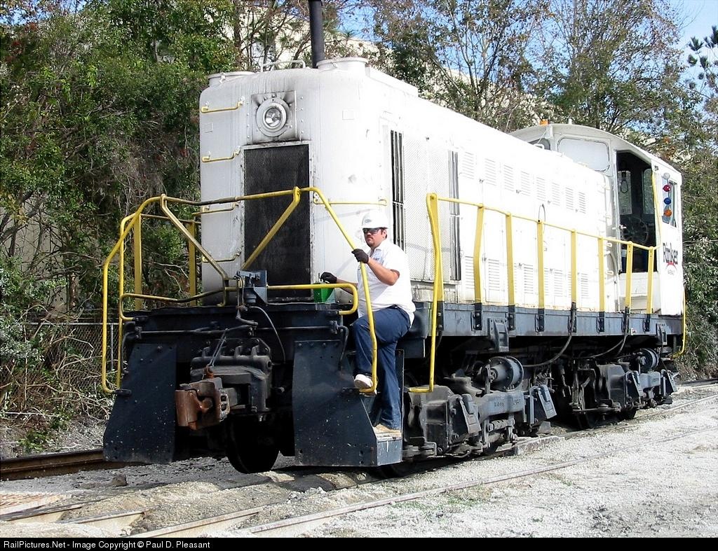 | Jesse, the Rinker engineer, heads for another cut of FEC aggregate cars. The little green box on the platform is the remote control. |