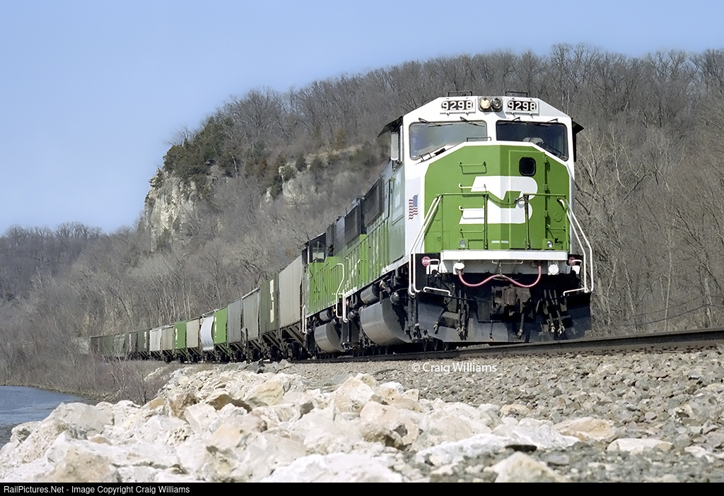 | The upgrade from the SD60, was the SD60M in 1989. BN was the first one to order 50 units that started delivery in December 1989 with #9200-9249. BN went with a 2nd order that began delivery in January 1991 with #9250-9298 and BN 1991. The 9298 was built in March 1991 and still looks great in its factory-new paint. Probably less than a month old, it has a grain train heading for Galesburg. The train passes Palisades Park on the north side of Savanna.