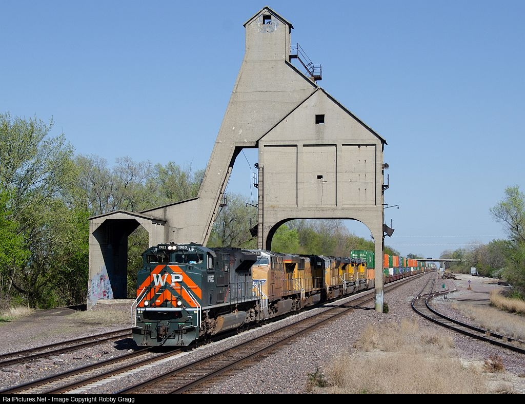 | UP 1983, the WP heritage unit, leads ZG2BR West under the coal chute in De Kalb. |